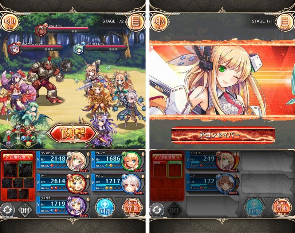 バトルはターン制になっていて、神姫たちの通常攻撃はワンボタンで発動できます。画面下のキャラのステータス部分をスワイプすると個別でスキルを発動でき、こちらは1スキルにつきバトル中に1回まで発動可能です。バーストというカッコいい必殺技もあり、通常攻撃やダメージを受けることでバーストゲージが貯まっていきます。このゲージはキャラクター毎に用意されているので、全員で同時にバーストを発動しバーストストリークという敵全員に大ダメージを与える全体技にすることも可能です。